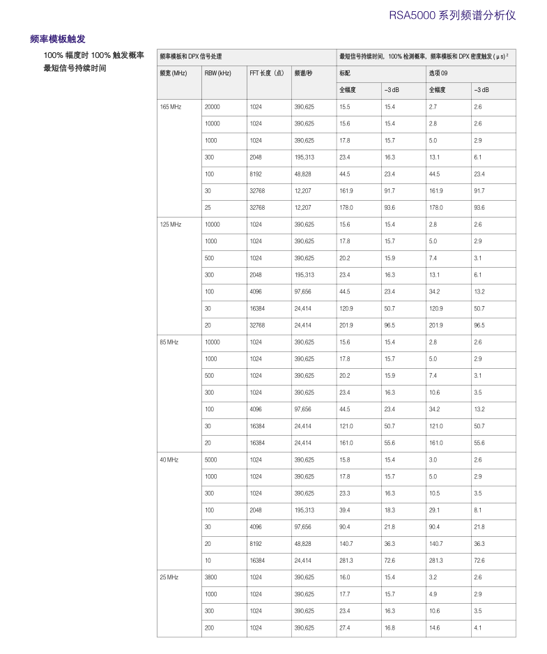 25 MHz、40 MHz、80 MHz、125 MHz 和 165 MHz